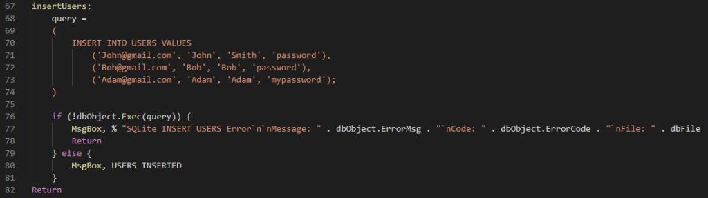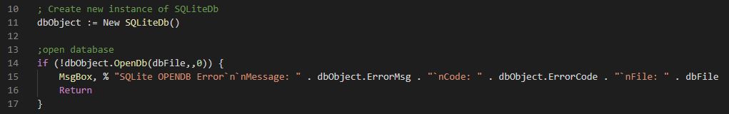 Here at line 11 we create an object of class SQLiteDB in the Class_SQLiteDB.ahk script. Next we open the database by using the method OpenDb and passing in three arguments first is the database file path, second is the access “W”rite, “R”ead, third a boolean whether the database should be created if the database file doesn’t exist. OpenDb will return false if there was any error that occurred during opening the database.