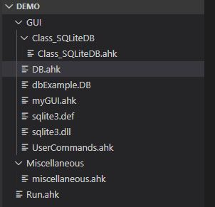 The file structure looks like this because in the next blog we will intergrate this DB concept with the GUI that was introduced in the previous blog. In this blog the new files are Class_SQLiteDB folder containing Class_SQLiteDB.ahk, DB.ahk(the script that we will run), dbExample.DB (The Database), Sqlite3.def, and sqlite3.dll.