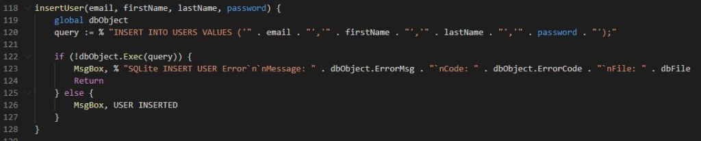In insertUser() function we use the key work “global” to use the variable dbObject that was introduced in the second blog. The query is a little different in line 120 we use % to say that anything that’s not wrapped in quotes is a variable and . dot is concatenate (in java would be + ).